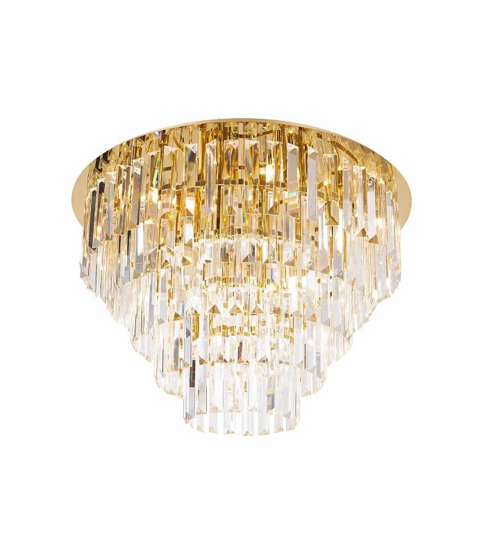 Wykonany w stylu glamour z wysokiej jakości metalu w kolorze złotym z kloszem z niezliczoną ilością szlifowanych szklanych elementów ułożonych kaskadowo, które pięknie odbijają światło. Wysokość lampy 44 cm, średnica lampy 60 cm. Możliwość stosowania żarówek Led.