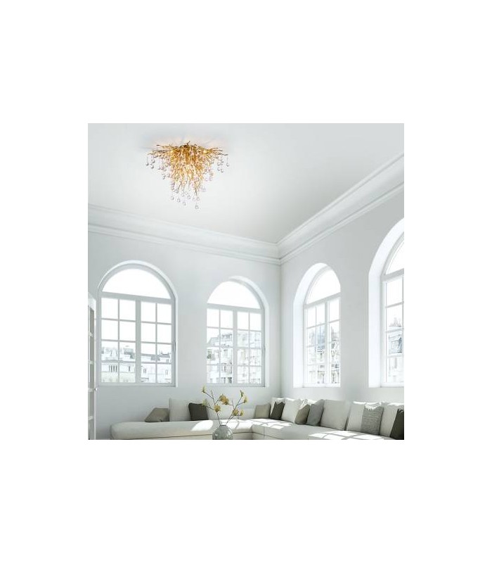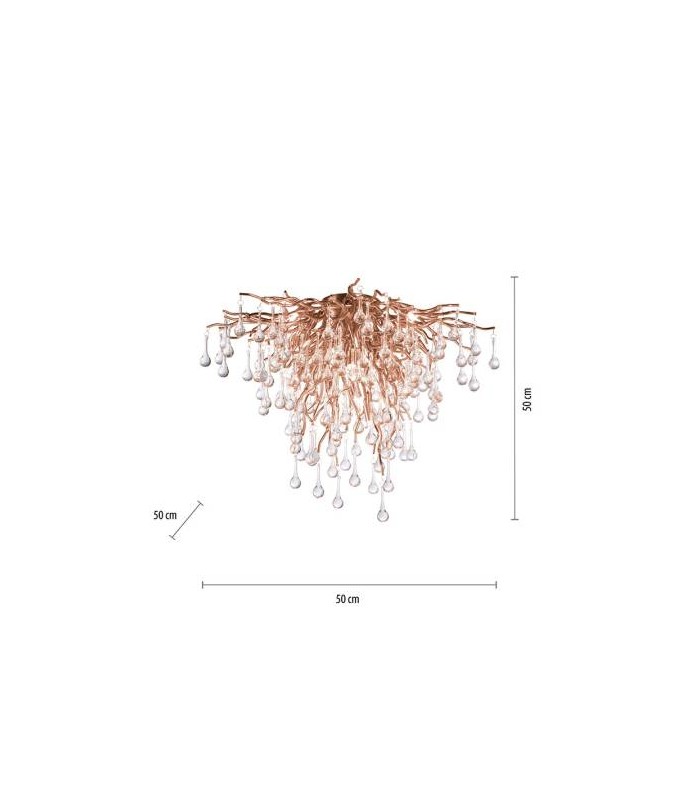 Wykonany z wysokiej jakości metalu w kolorze mosiądzu z kloszem o nietuzinkowym kształcie, przypominajacym drobne gałązki z wiszącymi sopelkami lodu z transparentnego szkła. Długość zwisu lampy 50 cm, średnica lampy 50 cm. Stosować żarówki Led