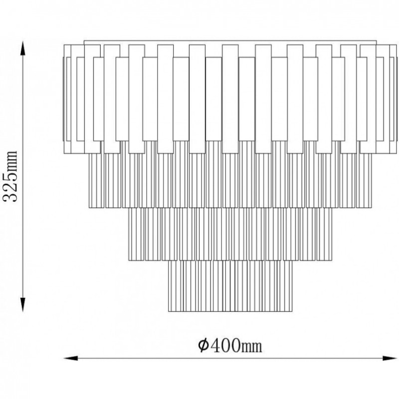 Wykonany z wysokiej jakości materiałów z kloszem z metalowych tubek w kolorze złotym i kryształówych elementów dekoracyjnch w kształcie tubek ułożonych kaskadowo. Długość zwisu lampy 32,5 cm, średnica lampy 40 cm. Stosować żarówki Led