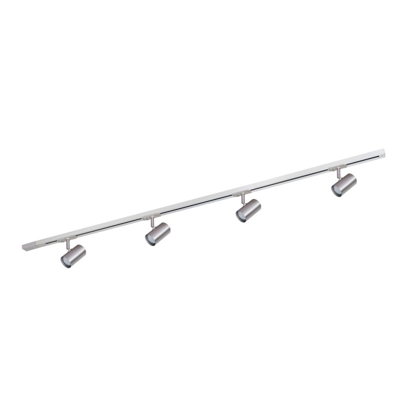 Lampa sufitowa 4-punktowa z reflektorami i zasilaniem z możliwością regulowania położenia reflektora. Wykonana z wysokiej jakości stopu metali w kolorze nikiel satynowany z reflektorami w kształcie tub o średnicy 5,2 cm. Szerokość lampy 150 cm, długość zwisu lampy 13 cm. Stosować żarówki Led