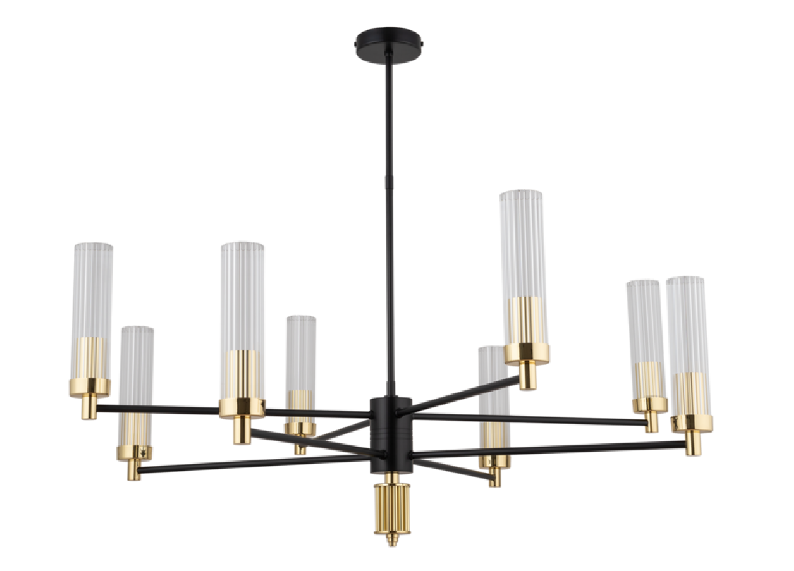Wykonany z wysokiej jakości mosiądzu polerowanego w kolorze czarno złotym z kloszami ze szkła ryflowanego. Długość zwisu lampy minimum 50 cm, średnica lampy 90 cm. Kolory opraw wybieramy indywidualnie ze wzornika kolorów zamieszczonego na zdjęciu. Możliwość stosowania żarówek Led.